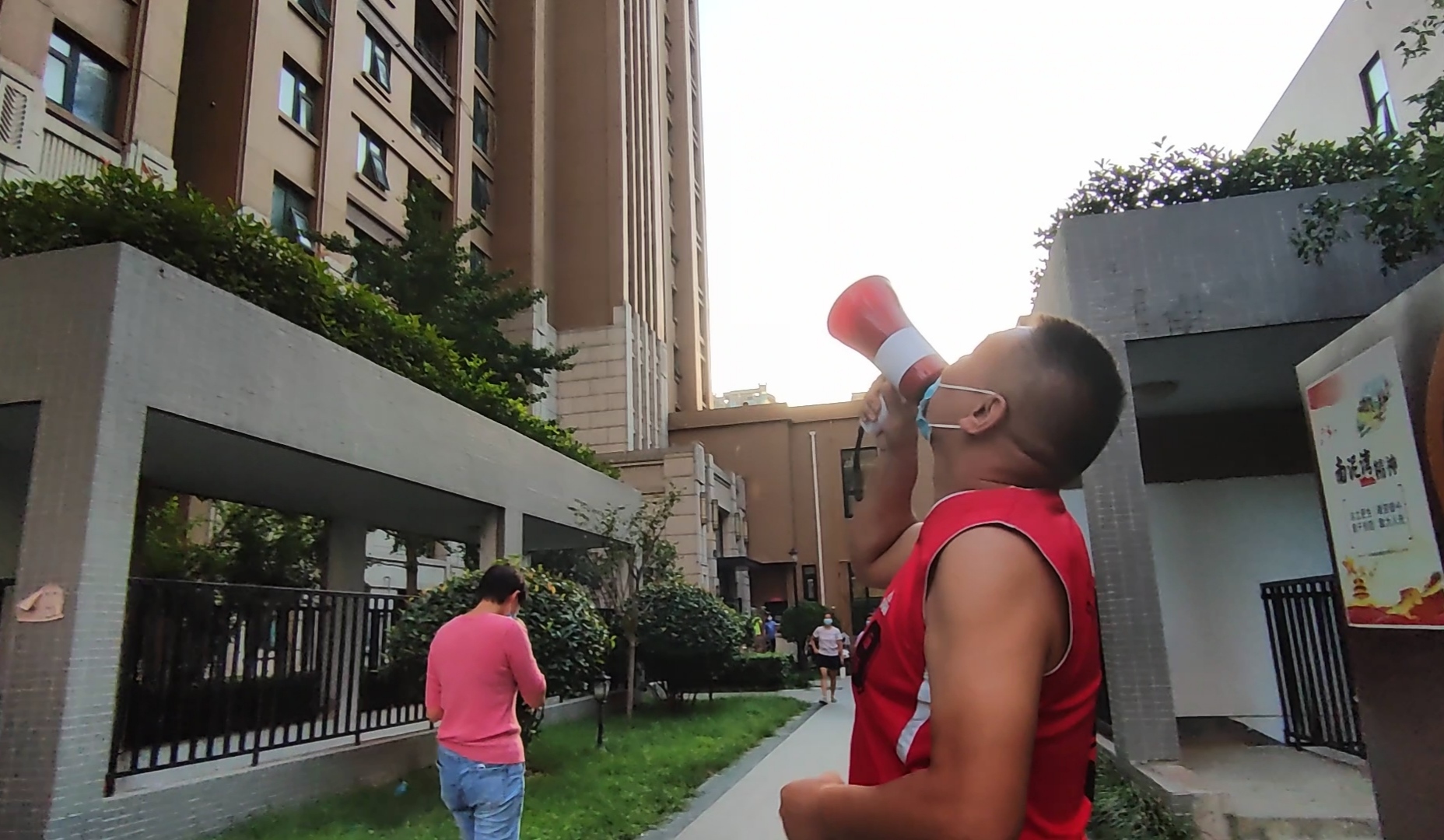 社区志愿者陈海召拿着喇叭喊未做核酸检测的居民快点下楼