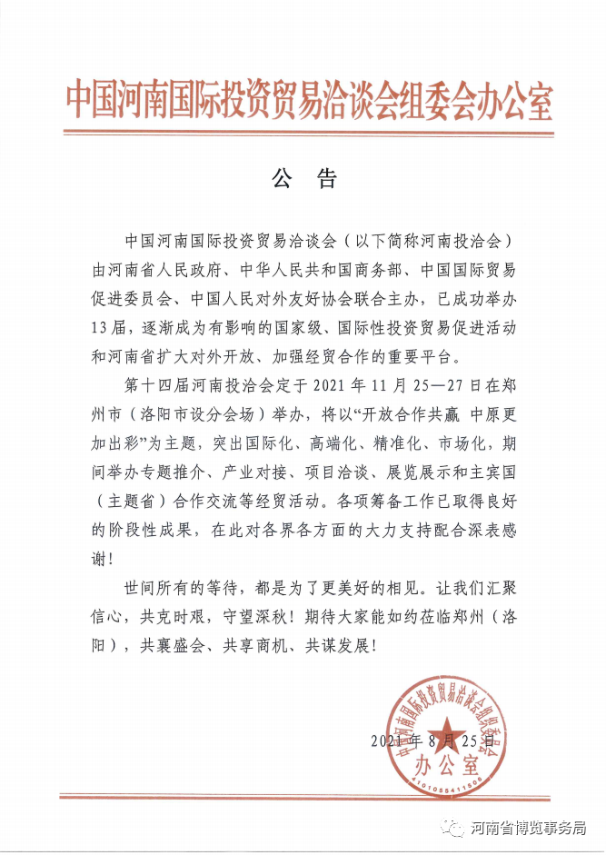 在投洽会组委会办公室发布的延期公告上写道:世间所有的等待,都是为了更美好的相见。让我们汇聚信心,共克时艰,守望深秋!期待大家能如约莅临郑州(洛阳),共襄盛会,共谋发展!
