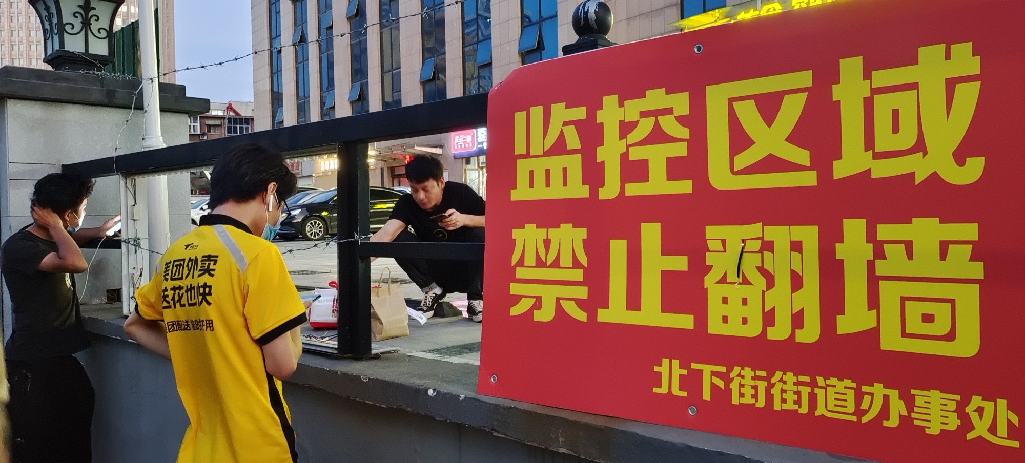 夜幕降临,华灯初上,位于二七路太康路东北角的一个被封控小区南门,悬挂着“监控区域 禁止翻墙”的提示牌,门禁内,商家拿着做好的餐品在等外卖小哥,门禁外,外卖小哥在等商家赶紧把餐品送过来。