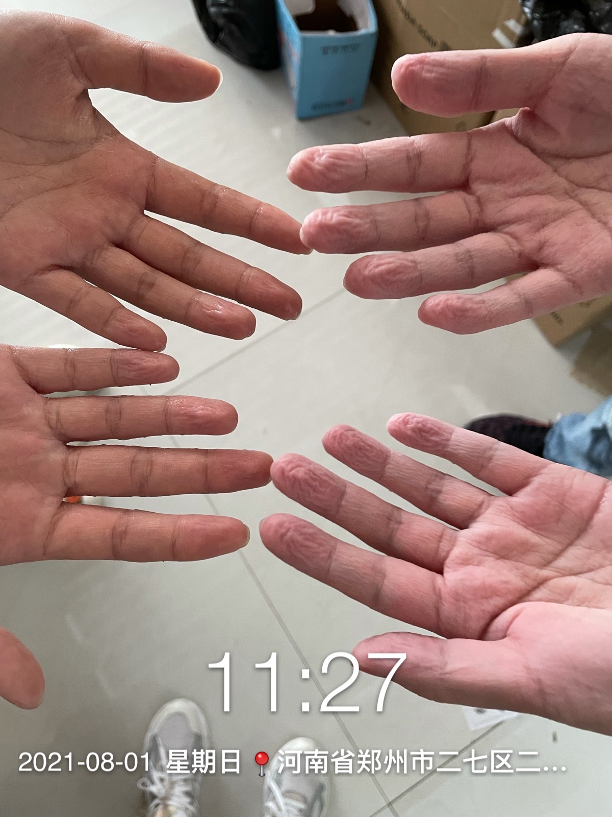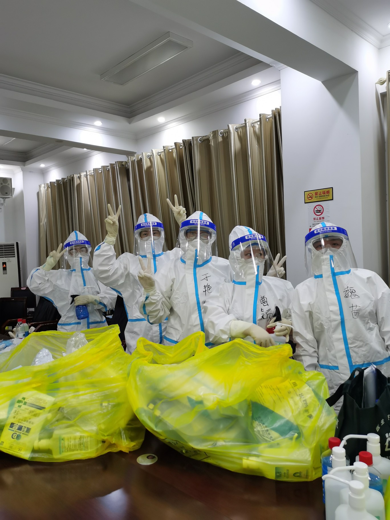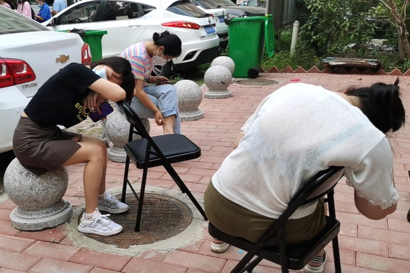 “你看这张照片,这是我们凌晨5点多完成第一次分配的采样任务,等待办事处调配新任务时,大家脱下防护服,简单吃了口早饭,趴在凳子上休息了一会儿。”李素粉边展示边向记者介绍。没一会儿,他们又继续开始新的采样任务,一直到中午。“我们的防护服脱下来全是汗,手也被汗水泡得发白,当时我已经30个小时没怎么合眼了,接电话的时候有一阵儿都不知道自己说了什么。”