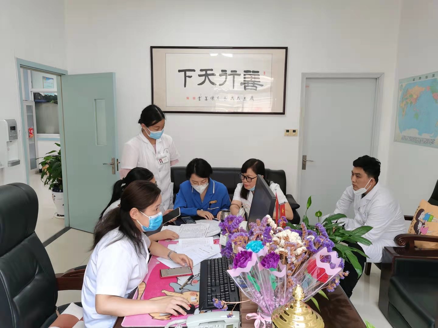 完成支援任务,李素粉直接回了办公室,稍作休息,又投入中心辖区内全员核酸检测的部署工作。
