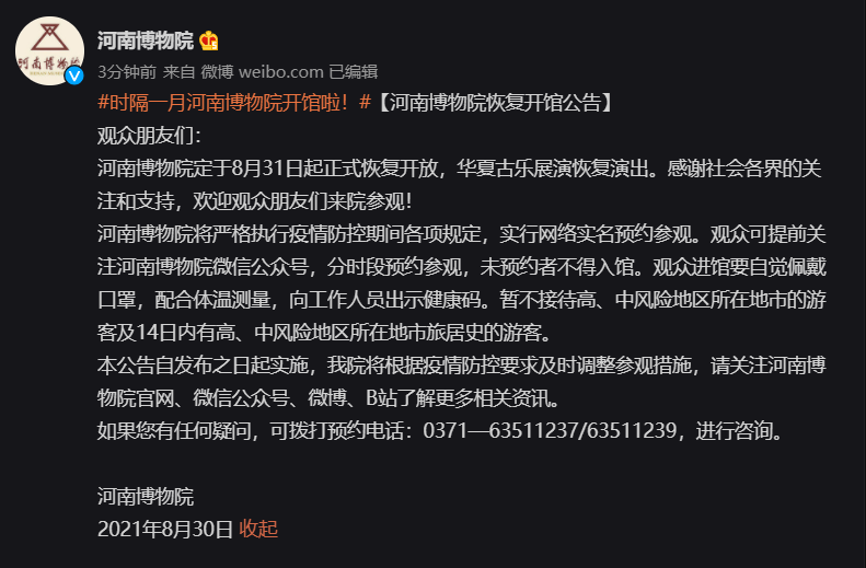 时隔一月,顶端新闻记者从河南博物院获悉,8月31日,河南博物院将重新恢复开放,同时,华夏古乐展演也将恢复演出。