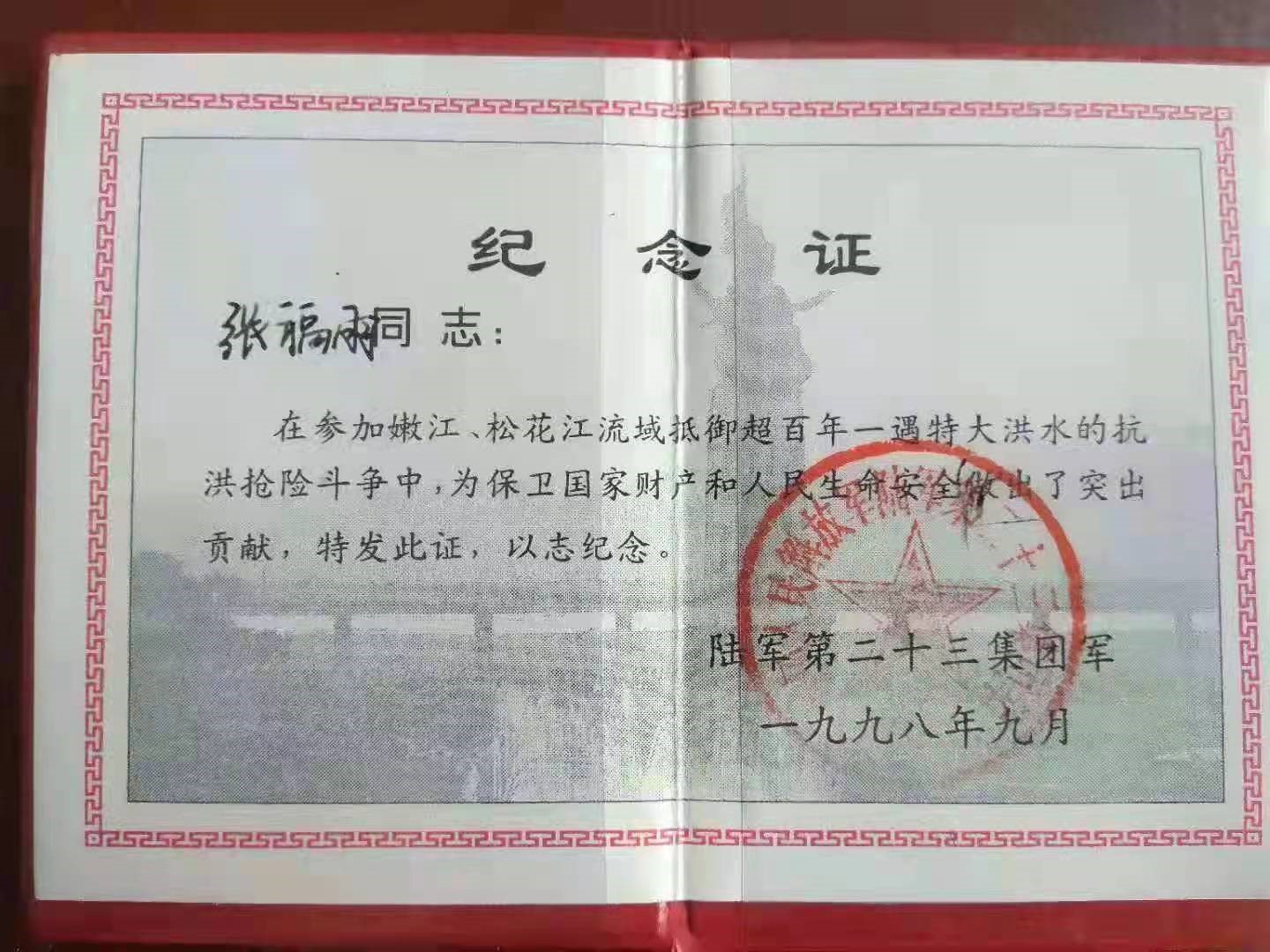 时间回到1998年,正在部队服役的张福雨参加了嫩江、松花江流域百年一遇的特大洪灾的抗洪抢险斗争,在哈尔滨纪念塔防洪段,他同战友们装沙袋、筑洪堤,当大堤快要决堤时,他同2000多名战友奋不顾身跳入水中用身体阻挡沙袋被洪水冲走,经过艰苦卓绝的奋斗,解放军战士们战胜了洪水,圆满完成了此次艰巨的任务。