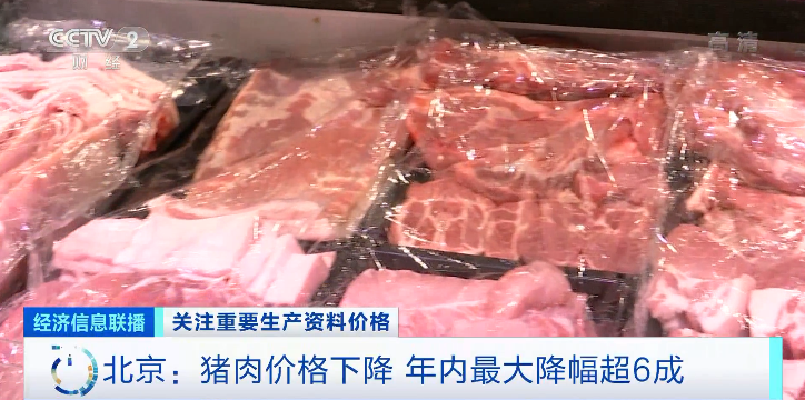 在北京东四环的一家超市,记者看到货架上的猪肉品类多达30多种,工作人员表示,所有的品类目前价格都出现了下调。 自年初到现在,猪前腿肉从19元降到12元,降幅接近40%;五花肉由50元下降到25元,降幅为50%。