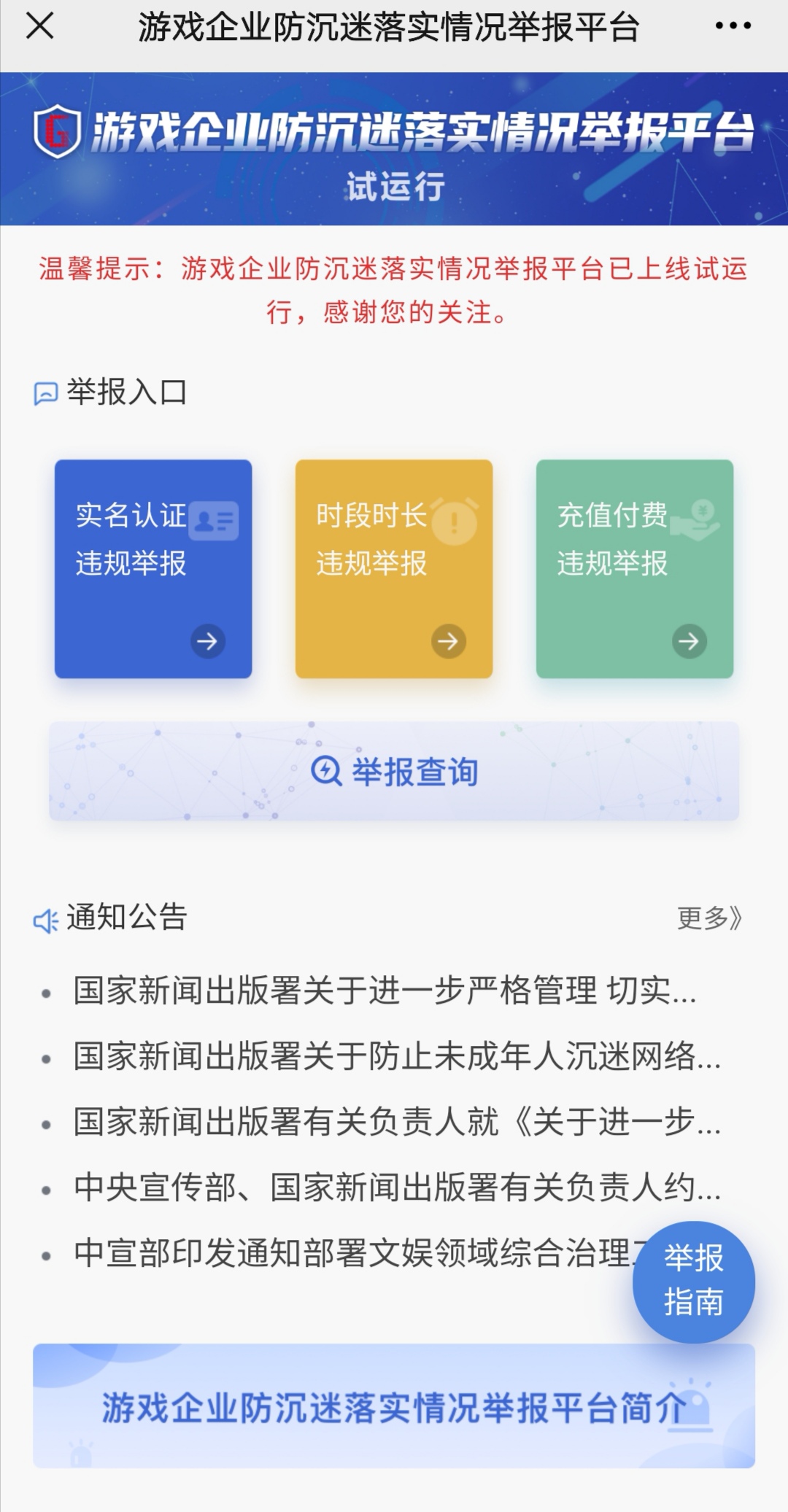 据介绍,游戏企业防沉迷落实情况举报平台是由国家新闻出版署设立的公众投诉受理渠道。平台主要功能是收集举报主体提供的游戏企业防沉迷措施落实情况,进一步严格管理、切实防止未成年人沉迷网络游戏。