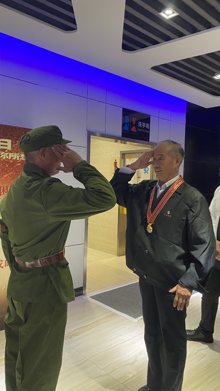 10月6日下午,观影前,特意穿着军装的李全义向抗美援朝老兵宋福清敬了一个军礼。看到此情此景,宋福清赶紧回礼。