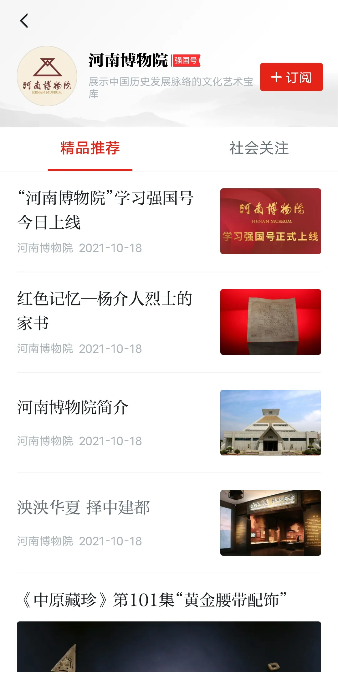 强国号开设有“精品推荐”“社会关注”两个栏目,通过图文、音视频等形式,推介河南博物院在展的基本陈列、专题陈列和临时陈列,开展文博知识科普及文物保护宣传,分享各媒体对河南博物院的关注报道。