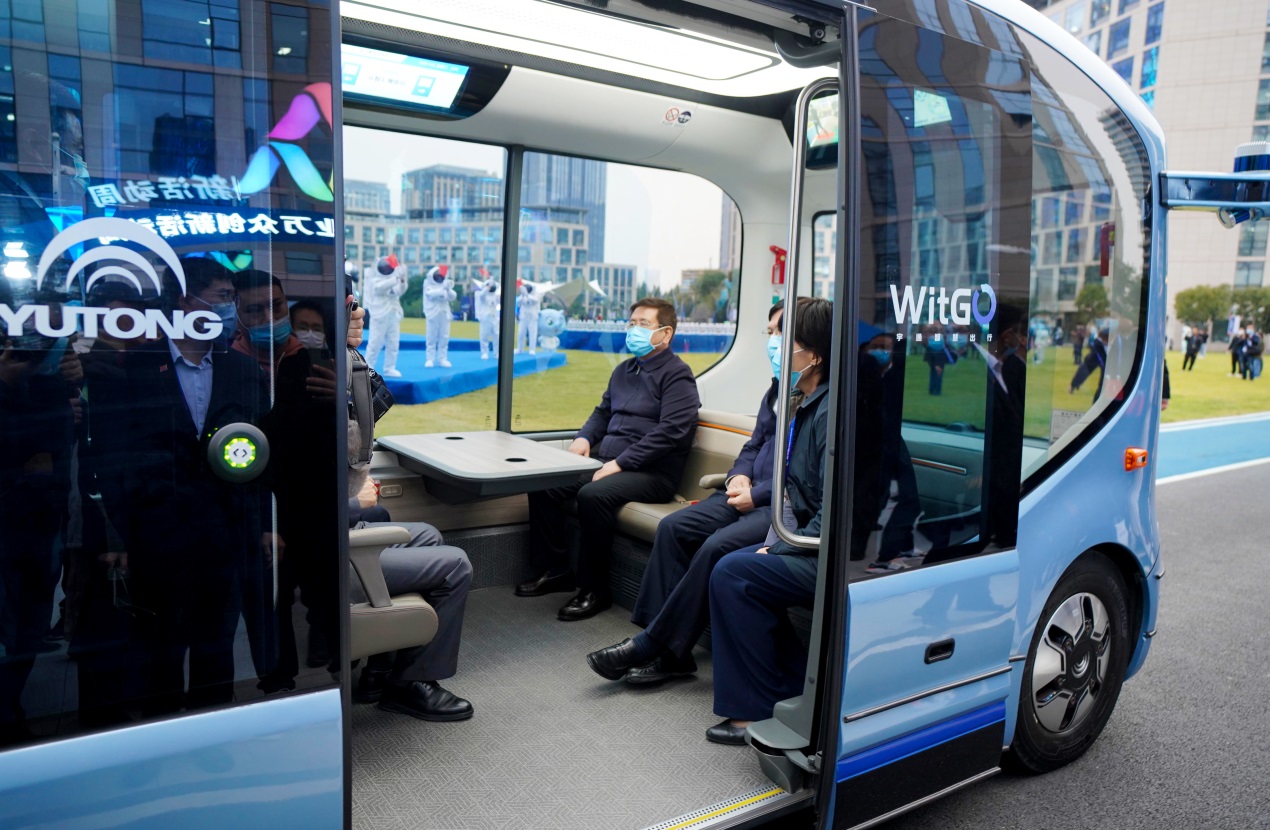 现场共开通两条智能驾驶巴士接驳线路,一条为智慧岛中央草坪线路,通过5个站点连接了5个核心展厅,另一条为智慧岛中环线路,在1.5公里的开放道路设置3个公交站,衔接了城市干线公交、地铁线路。智能驾驶黑科技在通勤保障中的创新运用,为嘉宾、领导们带来了一场精彩纷呈的“未来之旅”。