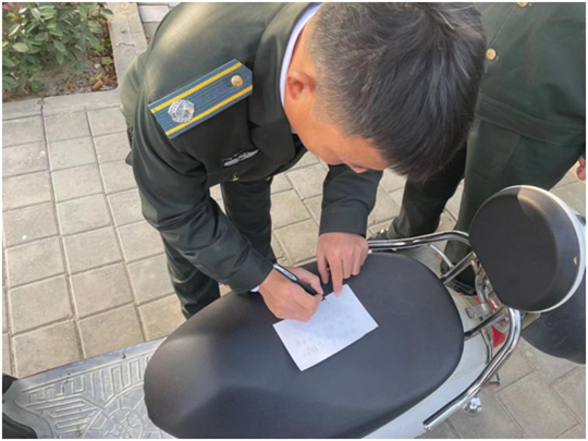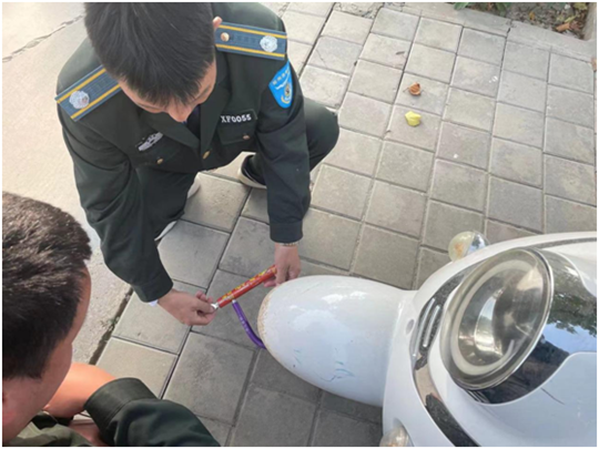 巡防队员贺红亮、贺亚楠、翟广州发现电动车通着电,钥匙也没拔,为防止车辆被盗,他们选择在原地留守等待。可过了半个多小时也不见人,于是为了安全起见,巡防队员联系同事拿来一把“爱心锁”暂时把车辆锁好,并留下纸条和联系电话。
