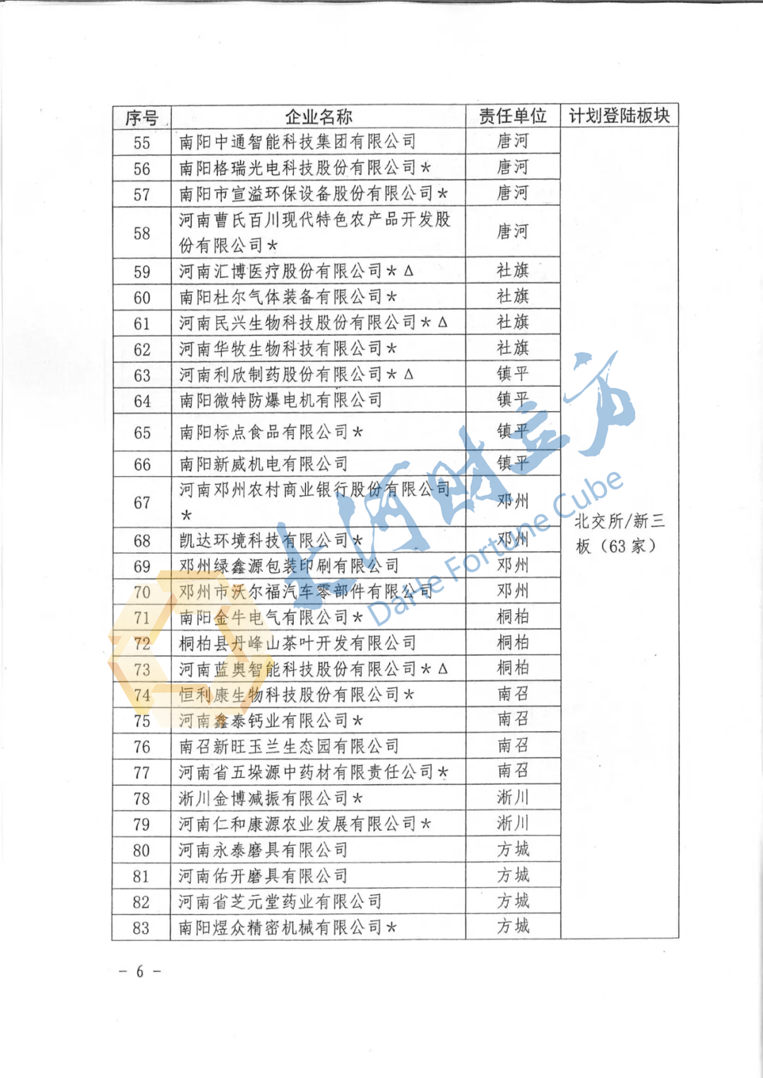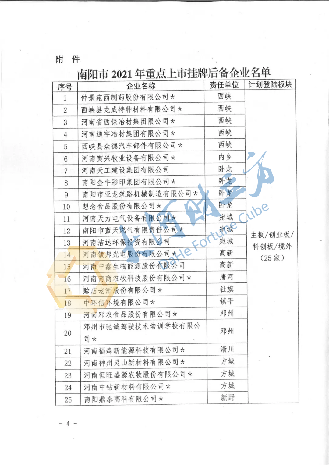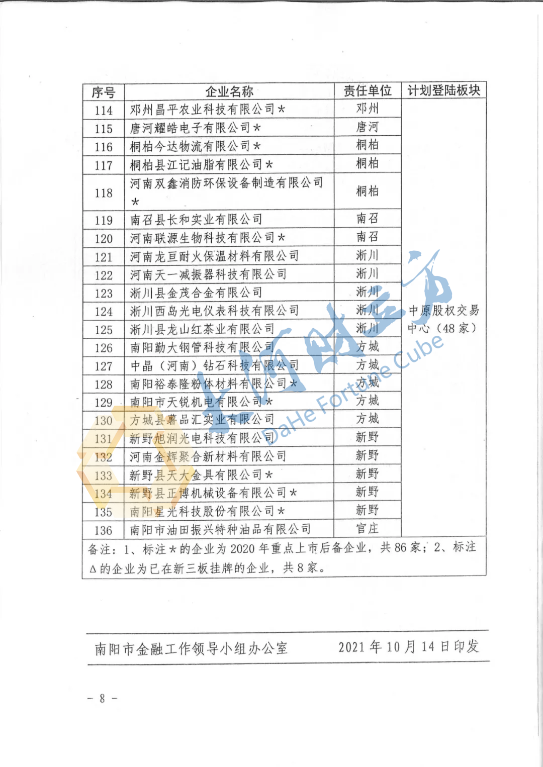 【大河财立方消息】10月26日,南阳市金融工作领导小组办公室公布2021年全市重点上市挂牌后备企业名单,确定仲景宛西制药等136家企业为南阳市重点上市挂牌后备企业。按照主板(及创业板、科创板、境外)、北交所(及新三板)、中原股权交易中心三个板块分类指导,重点培育。