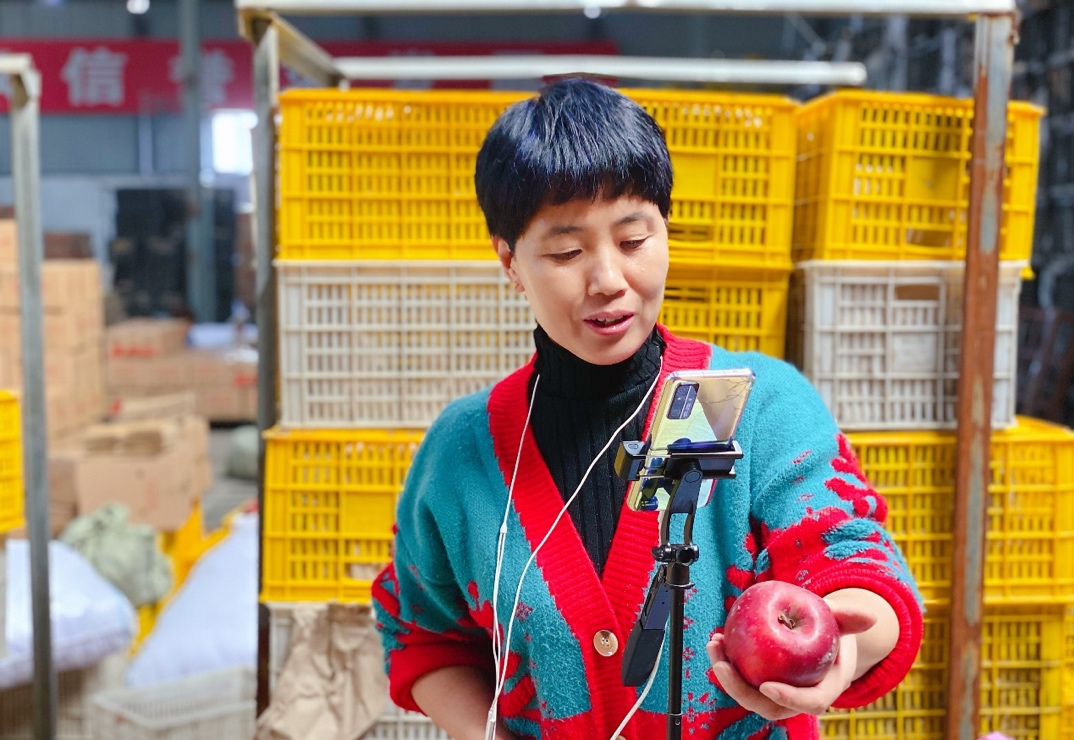 ▲ 霜降后,运城苹果品质越来越好。图为宏都果品的女主播正忙着直播卖果。郝曼|摄