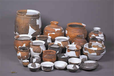 此外,一号院落南部发现了大型版筑遗迹。通过解剖得知,版筑遗迹被龙山文化早期地层所叠压,初步判断时代为遗址第四期晚段。兽骨坑、器物坑、陶窑等其他重要遗迹,也为遗址的分期分段提供了重要参考。如在判断时代为遗址第五期的坑内,出土了较多陶片、少量完整陶器、石器,以及大量蚌壳、兽牙、鱼骨、动物骨骼等。