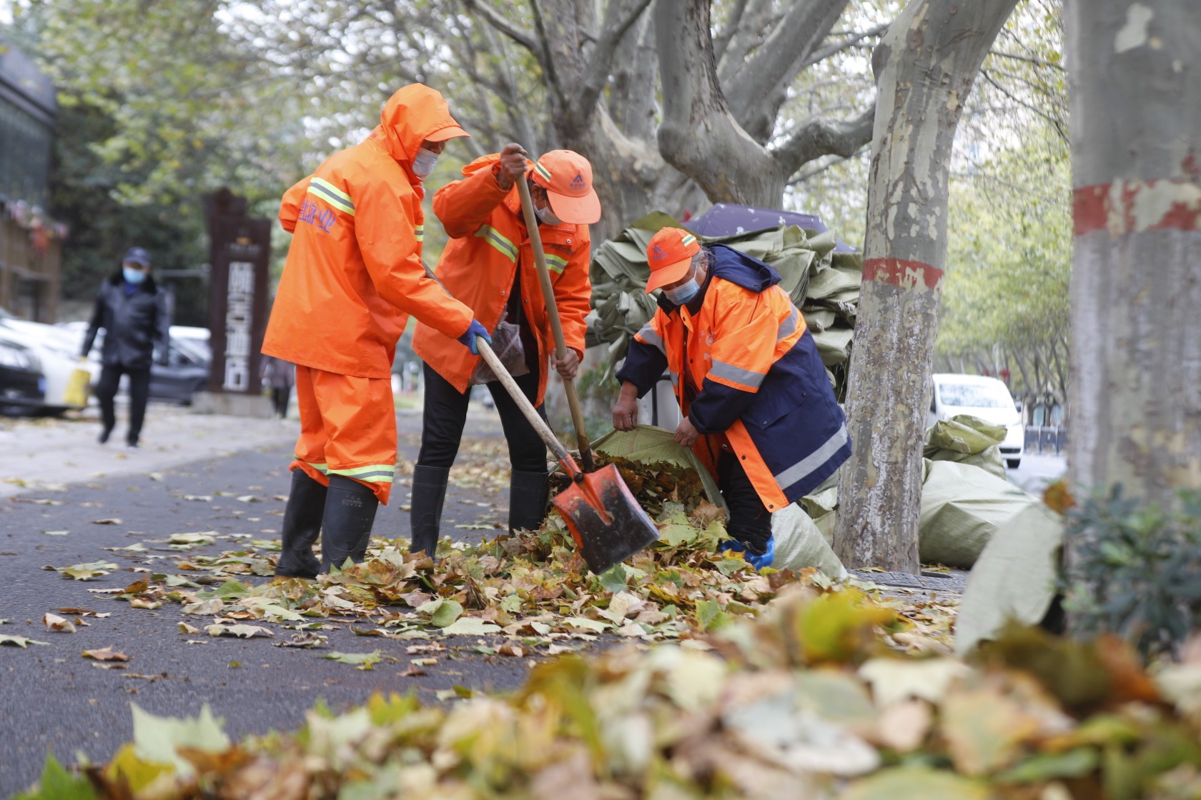·立冬寒潮来袭叶落满地 郑州环卫工人凌晨3点半开工战“落叶”