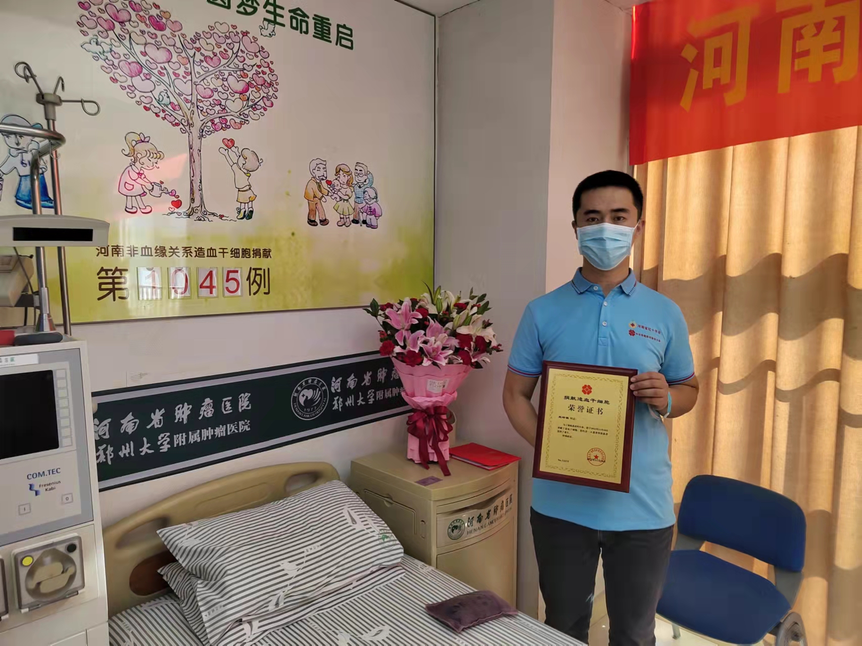 1988年出生的赵晗骁,是一位阳光帅气、开朗健谈、充满爱心的小伙子。参加工作10年间,赵晗骁积极参与社会公益活动和青年志愿服务,6次参与新乡市榴心社工组织的“图美乡村”活动,6次参与义务献血活动,累计献血2200ml。2017年6月,在单位组织的无偿献血活动中,赵晗骁了解并加入了造血干细胞捐献者资料库。经过4年等待,今年6月,赵晗骁接到了配型成功的电话,他立刻就同意了捐献,对于他来说,只要能救人,他都愿意。