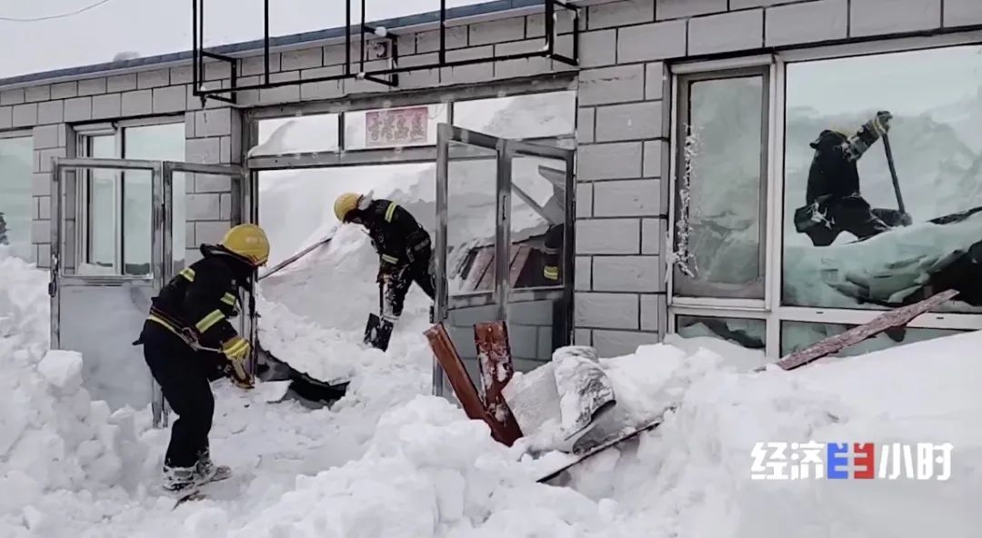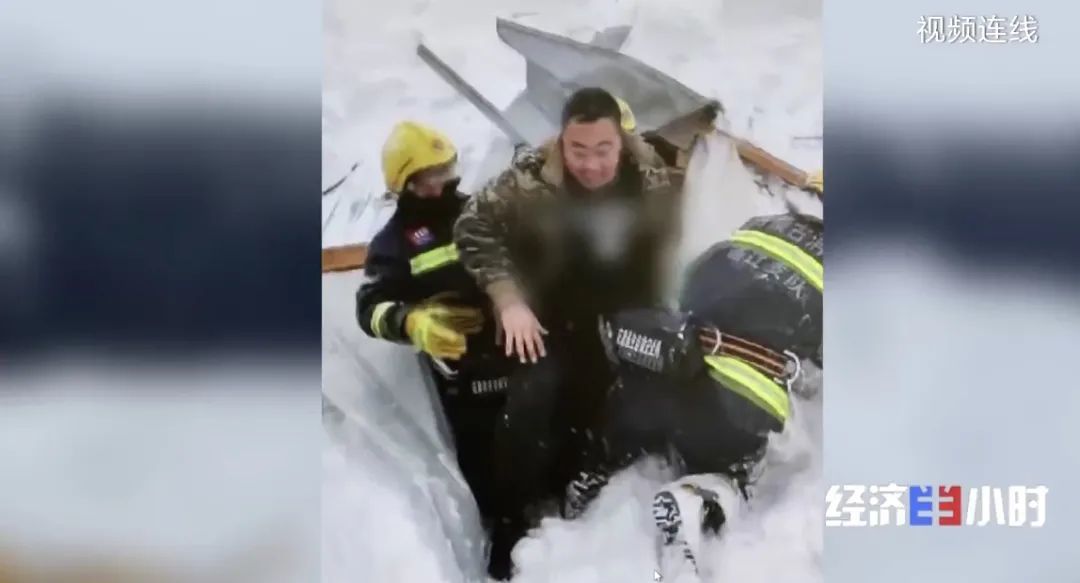 在消防救援人员的努力下,他们在雪堆里扒开一个口子,找到坍塌房顶和后面房子连接的地方,把彩钢、木板用破拆工具切割出一个方形缺口后,从里面拉出来一名被困群众。