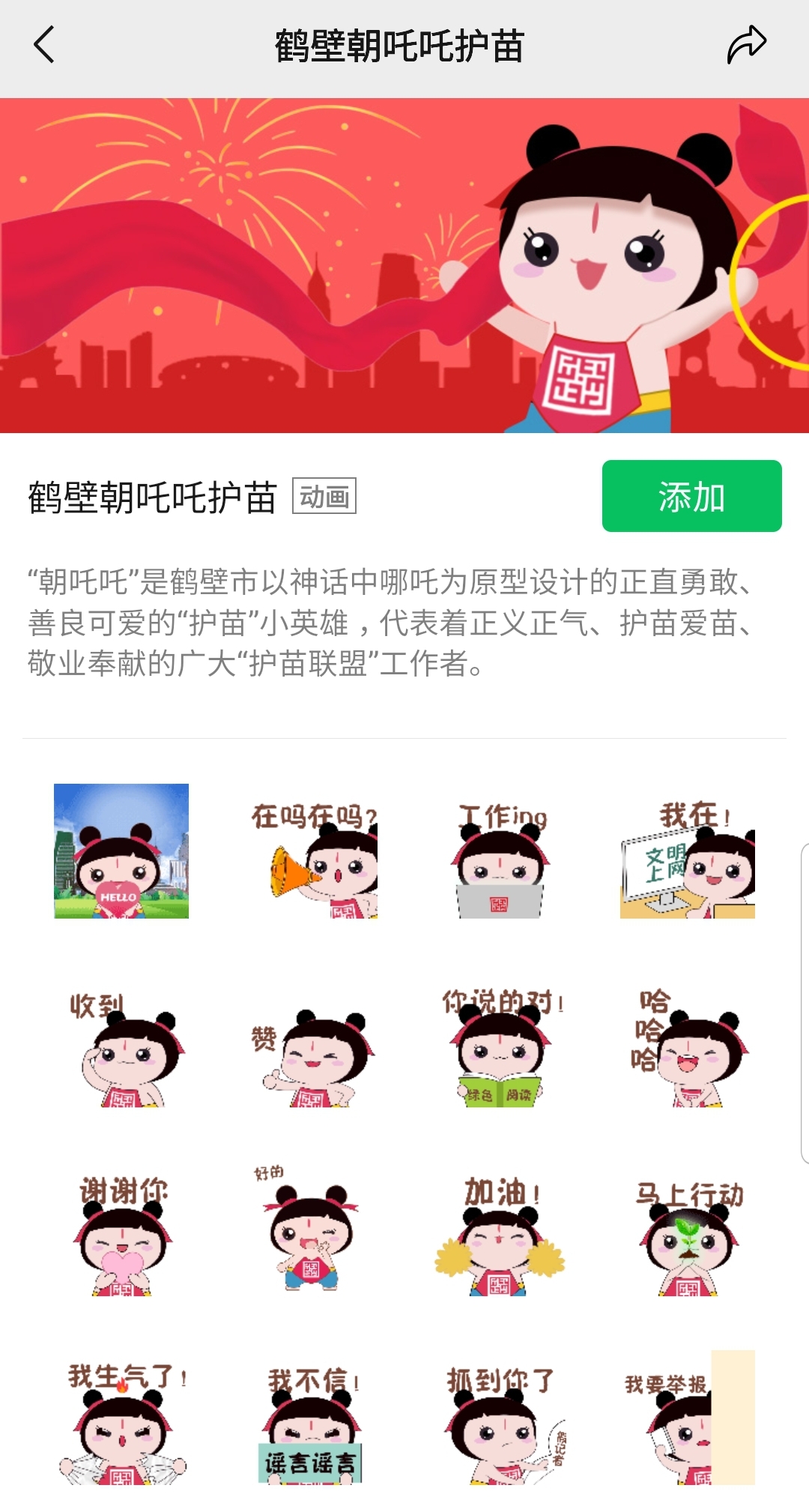“是他,是他,就是他!我们的朋友——小哪吒!”动画片中的“小哪吒”活跃在微信聊天中是怎样的场景?今年9月,“鹤壁朝吒吒护苗”微信表情包在微信表情商店上线。“鹤壁朝吒吒护苗”微信表情包一套共16款,涵盖多个日常生活用语和表情,运用多种形式渲染动画效果,一改往日“扫黄打非”宣传教育刻板乏味的印象。