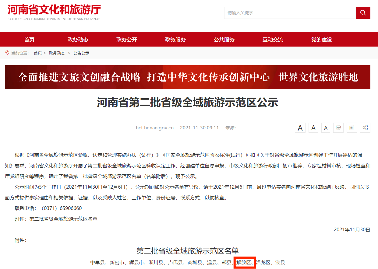 根据创建工作要求,解放区经积极申报、初审推荐、专家组审核、现场检查和省文旅厅党组研究等程序,确定为我省第二批省级全域旅游示范区,公示时间为2021年11月30日至12月6日。