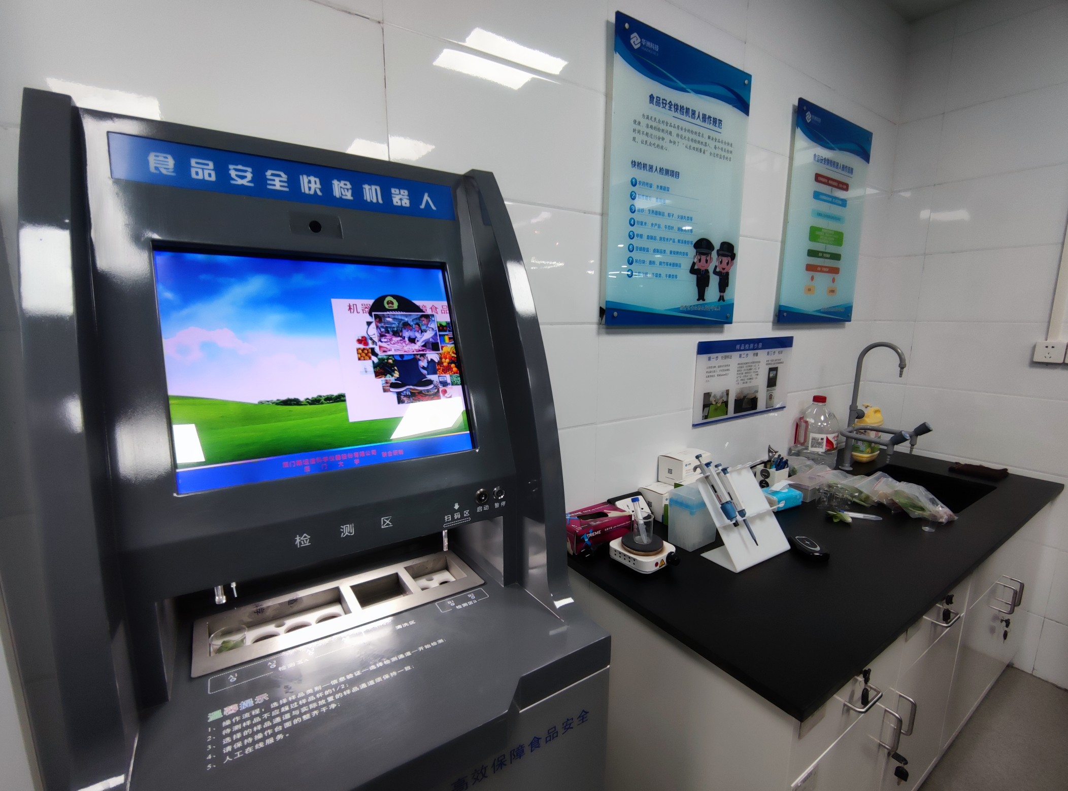 剪下菜叶,称重,然后放入自动检测机中……待检测试剂反应18分钟后便可以查看到结果。如果检测结果异常,只需一转身,“远程投诉举报屋”就派上用场了,可通过视频、语音、信息三种方式联系经开区市场监管局,实现远程可视投诉举报、食品辨伪识劣、食品安全知识咨询等。