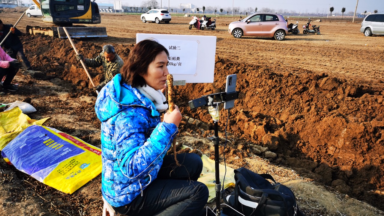 铁棍山药已成为了温县的地理标志,这也吸引了网络主播“果缨河南特产”来到挖山药的现场进行网络直播。