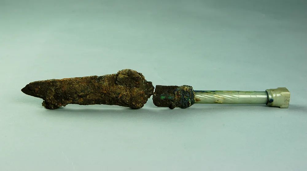 由铁质剑身、玉质剑柄和铜质柄芯组合而成。铜柄芯与剑身两面锻合,柄芯前段作条状,利于与剑身脊部锻接,柄芯的表面镶嵌有条状的绿松石片,柄芯下段圆形,套入中空的玉柄之内。玉柄由茎、首两部分套接而成,皆为和田青玉。柄 茎圆柱中空,以纳铜柄芯。玉柄首中部镶嵌绿松石片,两侧有透穿小圆孔,贯以铜质销钉以固定铜芯与柄首。玉柄铁剑有“中华第一剑”之称,是我国目前发现年代最早的人工冶铁制品,其铁质剑身经检验属于块炼渗碳钢。年代距今2800年,打破了秦国铜柄铁剑2600年的中国最古老冶炼铁器记录,把中原人工冶铁的历史向前推进了200年。