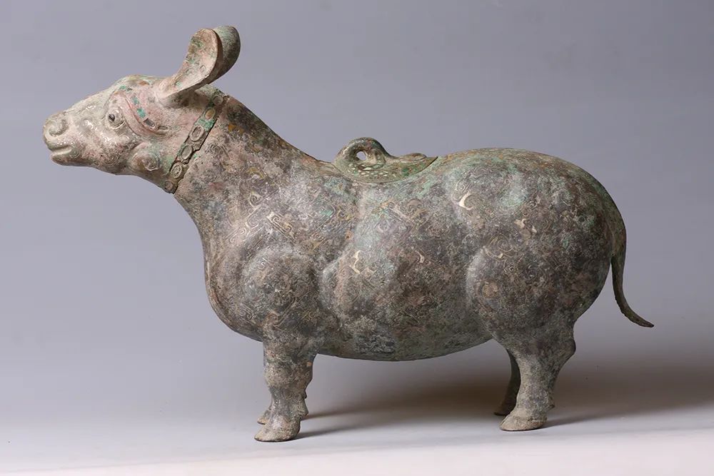 仿牛形,昂首竖耳,偶蹄。由头颅,体、盖分铸而成。首颈结合,有一项圈合缝自然遮掩,盖为一扁嘴长颈禽,禽颈反折,嘴紧贴背上,巧成半环形盖钮。两翅平展,羽翎均以绿松石铺填,通体是粗细相间的金、银丝嵌饰的几何云纹。此器设计独特,工艺娴熟,是战国时错金银工艺的佳品,反映了齐国工艺技术水平的高超。