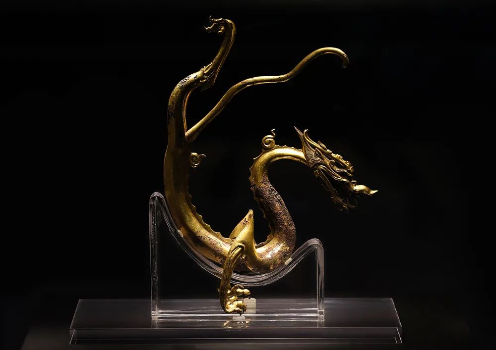 铜龙实际上是由铁芯铜壁铸造而成,表面鎏金,身体细长,两只有力的前脚紧扣地面,龙头与上身呈“S”型,龙嘴张开,露出牙齿和弯曲的龙舌,两只圆睁的双眼直视前方,龙角紧贴头部向后伸展,龙尾从高高上扬的后肢处反折向龙头上方。整条铜龙身体流畅,极富动感,体现出唐代龙的生动美与气势美,堪称精品。