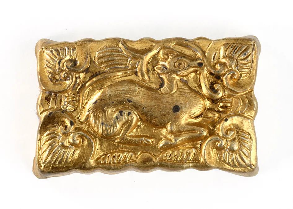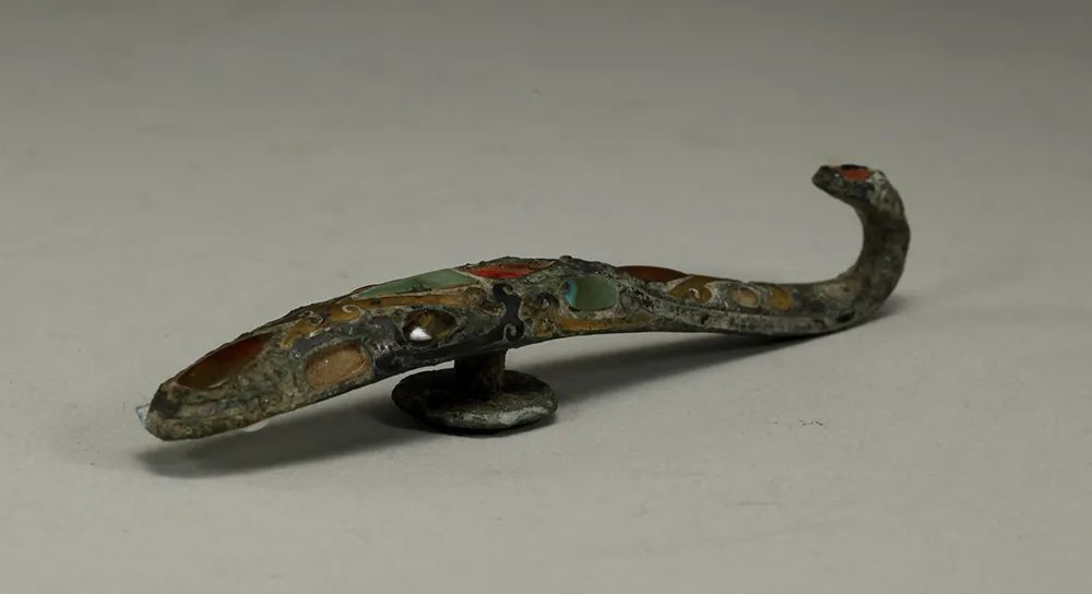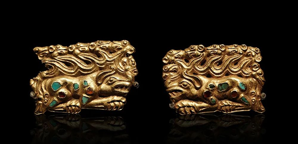 带饰下部为虎,张嘴露齿,四肢前屈,尾部下垂,身躯部位镶嵌红、绿等宝石,部分脱落。在虎的身上及尾部,有并列的群鸟,鸟身简化为S形。