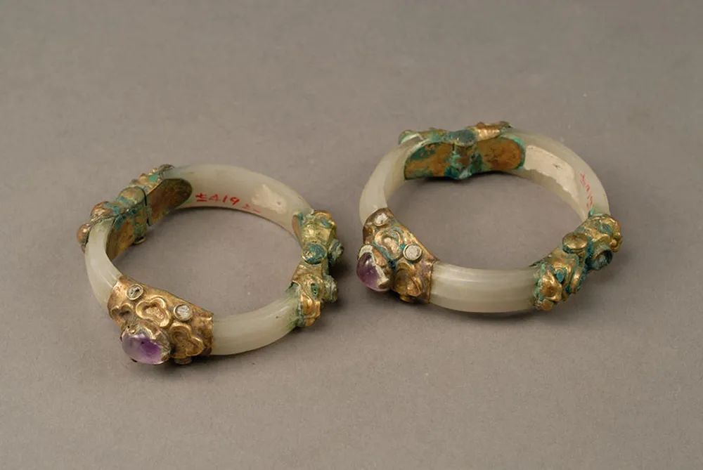 玉臂环由三段弧形白玉连接而成,每段玉的两端均包以金制兽首形合页,并以两枚金钉铆接,合页外缘均琢成虎头形,头向相背,头顶嵌浅紫色宝石,眼球镶料珠。玉臂环出土时装在莲瓣纹银罐内,银罐盖墨书“玉臂环四”,知其本来称谓即此。唐代文献中还将这种臂环称为“玉臂支”。从文献看,玉臂环似非唐代本土的产物,可能为进贡或从对外战争中所得。