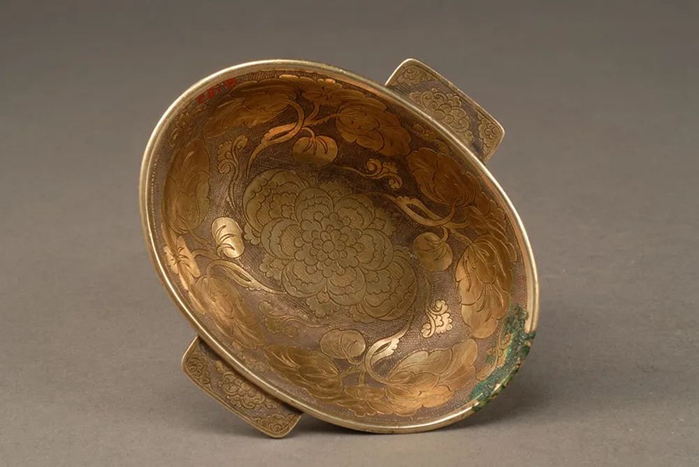 这件羽觞在工艺上采用鎏金錾花的方法制成。这些花纹以满地装的艺术手法布满整个器物,加之刻花处鎏金,使得器物金光灿灿,富丽堂皇,为典型的盛唐器物。