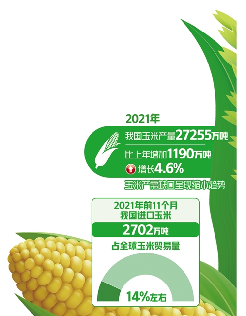 在国家政策支持下,近两年玉米播种面积和产量持续增加。国家统计局数据显示,2021年我国玉米产量27255万吨,比上年增加1190万吨,增长4.6%,玉米产需缺口呈现缩小趋势。国家粮油信息中心预计,2021—2022年度国内玉米产量增加,供需形势将进一步改善,国内饲料粮供应有保障。