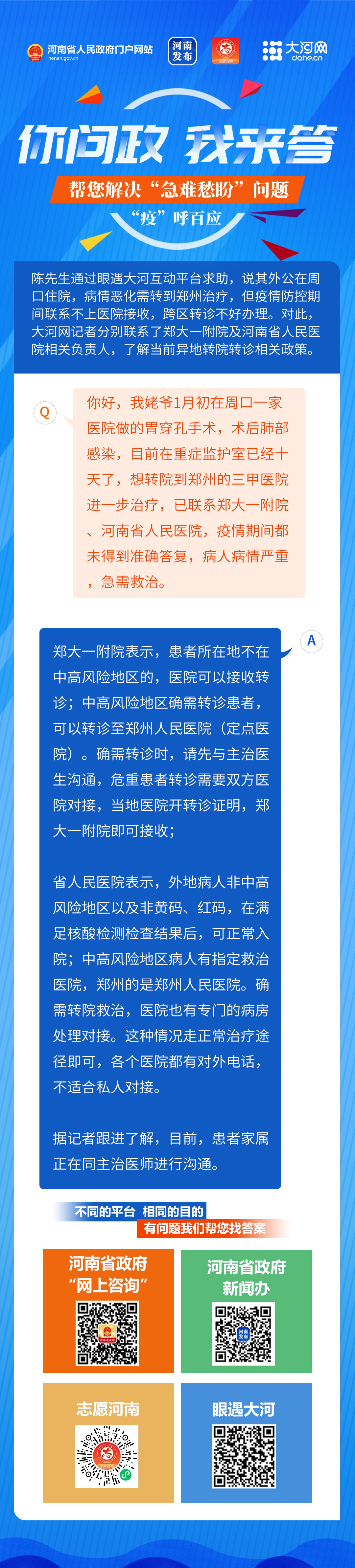 Q:你好,我的姥爷是一名退休教师,今年1月初在周口市一家医院做胃穿孔手术,肺部引起感染,在重症监护室已经十天了还不见好转,我们想转院到郑州的三甲医院进行治疗,联系了郑大一附院、河南省人民医院,疫情期间都未得到准确答复,病人目前病情严重,急需救治,万分感谢!