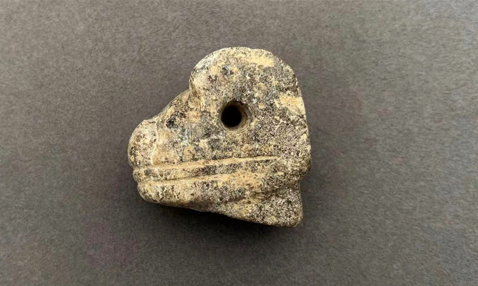 考古人员还发现了一枚颇具红山文化特征的兽首石雕,它雕琢精美,外形似虎头,从整体造型和制作工艺来看,考古人员初步推断石雕可能为权杖头部构件。这种石雕在中原地区同时期的遗址中是首次发现,为探讨发源于东北地区的红山文化与中原地区的社会上层交流,提供了重要物质见证。