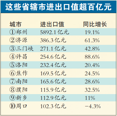 郑州等10个省辖市进出口值超100亿元
