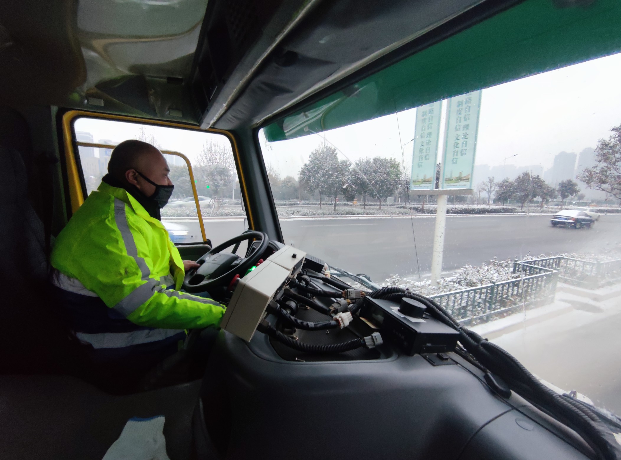 在嵩山路绿水路交叉口,雪辊车司机姚志强中午饭在车上凑合着吃了几口,随即又投入到紧张的除雪作业中。整个南环项目分部共有37辆这样的大型除雪设备,车辆24小时不停机,人员分白班夜班轮班上岗。