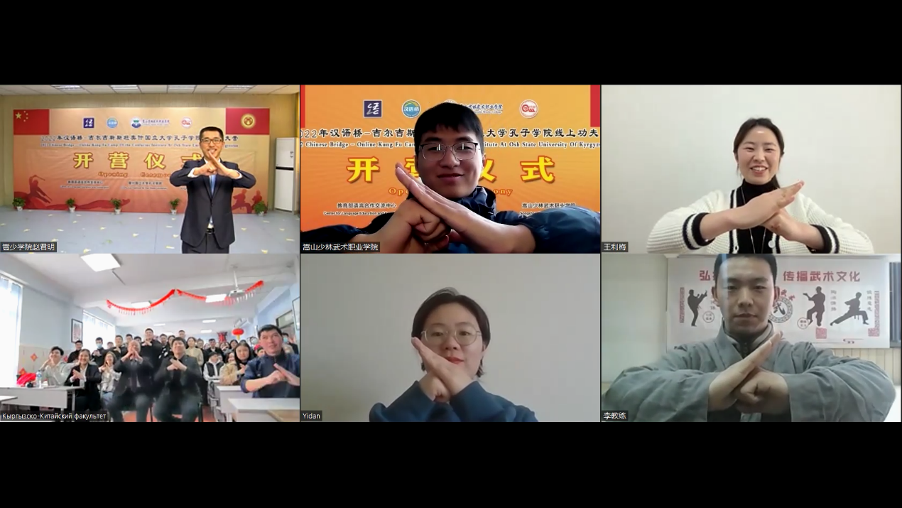 大河网讯 2月24日,由教育部中外语言合作交流中心主办、嵩山少林武术职业学院和奥什大学孔子学院合办的2022年汉语桥—吉尔吉斯斯坦奥什国立大学孔子学院线上功夫营团组交流项目正式开营。嵩山少林武术职业学院院长助理刘少菲,国际部教师赵君明,5位汉语老师、5位武术教练以及吉尔吉斯斯坦奥什国立大学100名营员参加开营仪式,仪式由赵君明主持。