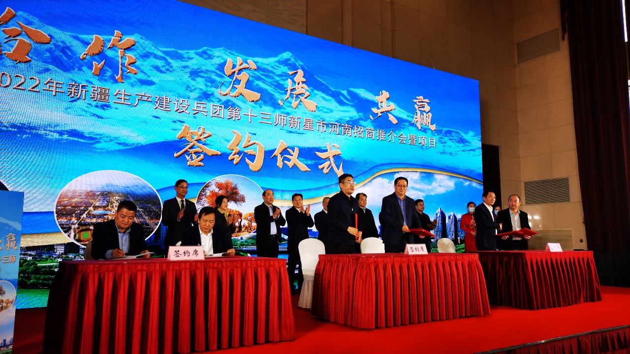 大河网讯 (记者 宋向乐)3月2日上午,2022年新疆生产建设兵团第十三师新星市河南招商推介会暨项目签约仪式在郑州举行,现场签约56个项目,总投资209.66亿元,涉及文化产业、新能源、医疗器械、化工等多个行业。