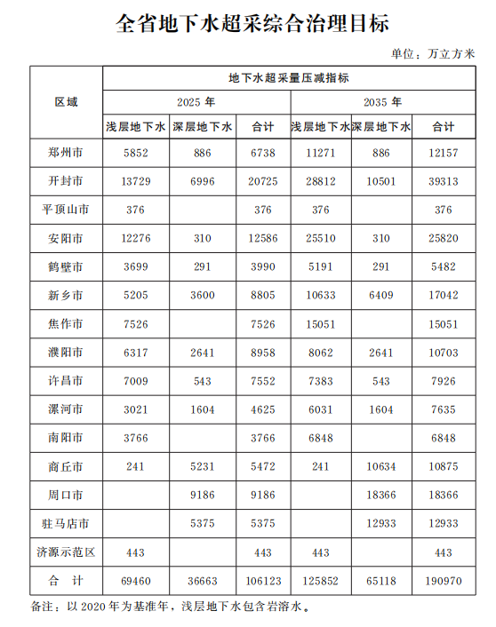 《实施意见》明确,到2025年,力争压减地下水超采量10.61亿立方米,南水北调、引江济淮、引黄工程供水区城镇地下水超采量全部压减,其他区域城镇地下水超采量压减90%以上,全省地下水水位降幅总体趋缓。到2035年,压减地下水超采量19.1亿立方米,除分散居住的农村居民生活用水和部分特殊行业用水外其他地下水超采量全部压减,全省地下水实现采补平衡、水位止跌回升。