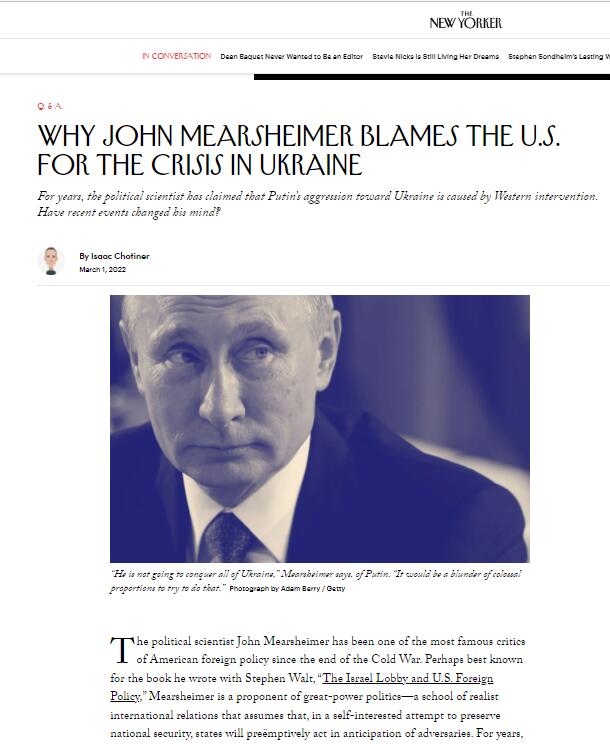 中国日报网3月11日电 美国《纽约人》周刊网站3月1日发表题为《为什么约翰•米尔斯海默把乌克兰危机归咎于美国》的文章,作者是该刊特约撰稿人伊萨克•肖蒂纳。政治学家约翰•米尔斯海默(John Mearsheimer)是冷战结束以来美国外交政策最著名的批评家之一。