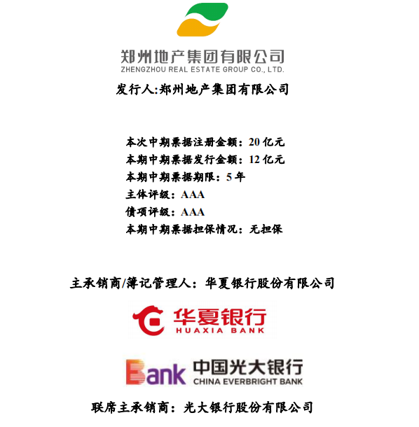 据披露,郑州地产集团此次中期票据注册金额为20亿元,本期拟发行金额12亿元,发行期限5年,起息日至付息日为2022年3月18日至2022年~2027年每年的3月18日,主承销商及簿记管理人为华夏银行,联席主承销商为光大银行。经评定,郑州地产集团主体信用评级AAA,债项评级AAA。