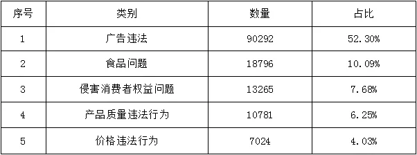 涉及广告违法的举报共计90292件,占举报总量的52.3%,主要问题有:一是对于产品或者服务本身的质量效果等存在虚假描述;二是以欺骗性有奖促销,虚假打折、让利,夸大产品功效,以次充好;三是违规宣传医疗保健功效。