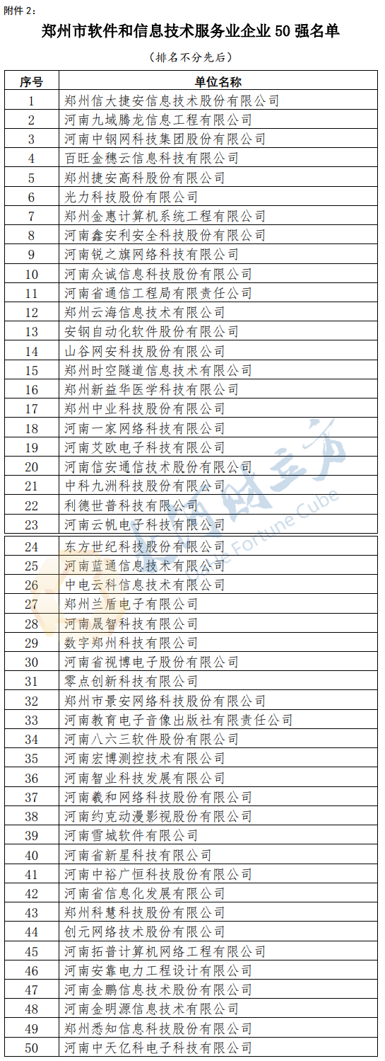 【大河财立方消息】3月18日,据郑州市信息化促进会,为充分发挥电子信息、软件和信息技术服务领域重点骨干企业示范引领作用,促进郑州市电子信息、软件和信息技术服务业高质量发展,在郑州市工信局、郑州市民管中心的指导下,经企业申报、材料审核、初审、评审等程序,拟定鸿富锦精密电子(郑州)有限公司等50家企业为郑州市电子信息企业50强、郑州信大捷安信息技术股份有限公司等50家企业为郑州市软件和信息技术服务业企业50强,公示时间为3月18日~3月22日。