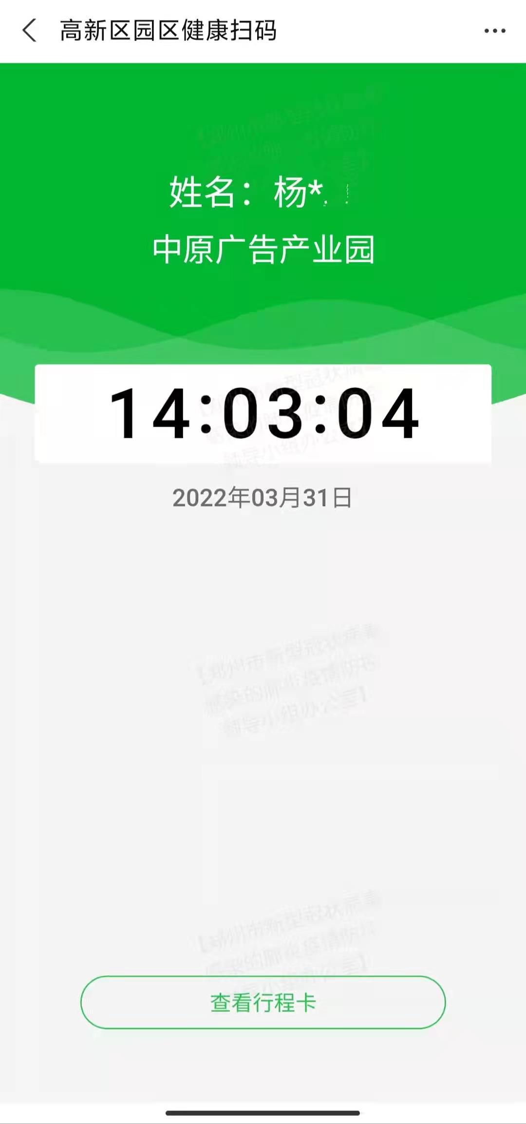 3月31日中午,在郑州市高新区上班的小杨,吃过午饭,再次扫码进入办公楼时,她惊奇地发现,扫码后健康码不但显示自己的姓名,所在区域还增加了进入办公楼的时间,底部还增加“查看行程卡”一栏,点击就可查看行程码。