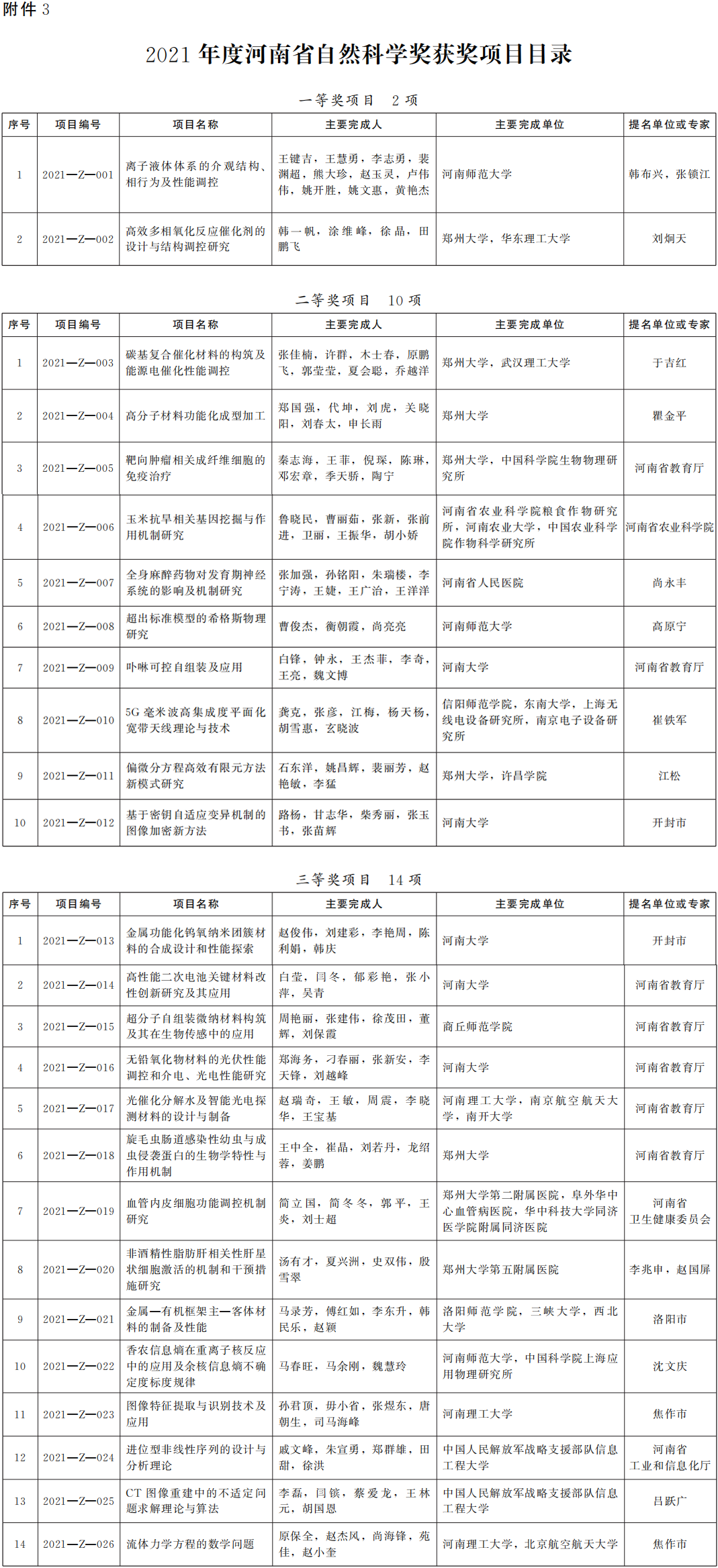根据《河南省科学技术奖励办法》(省政府令第57号)规定,经省政府常务会议审议,决定授予王家耀院士、白跃宇研究员2021年度河南省科学技术杰出贡献奖;授予杰弗瑞·威廉·谢尔曼教授等4名外籍专家河南省科学技术合作奖;授予“离子液体体系的介观结构、相行为及性能调控”等26项成果河南省自然科学奖,其中一等奖2项、二等奖10项、三等奖14项;授予“低排放高活性复合钎料创制及协同效用”等13项成果河南省技术发明奖,其中一等奖2项、二等奖6项、三等奖5项;授予“优质高产小麦新品种郑麦379的选育及应用”等254项成果河南省科学技术进步奖,其中一等奖21项、二等奖97项、三等奖136项。