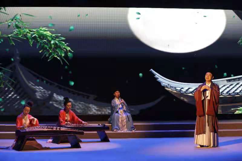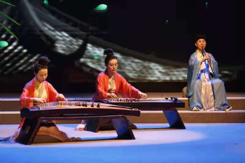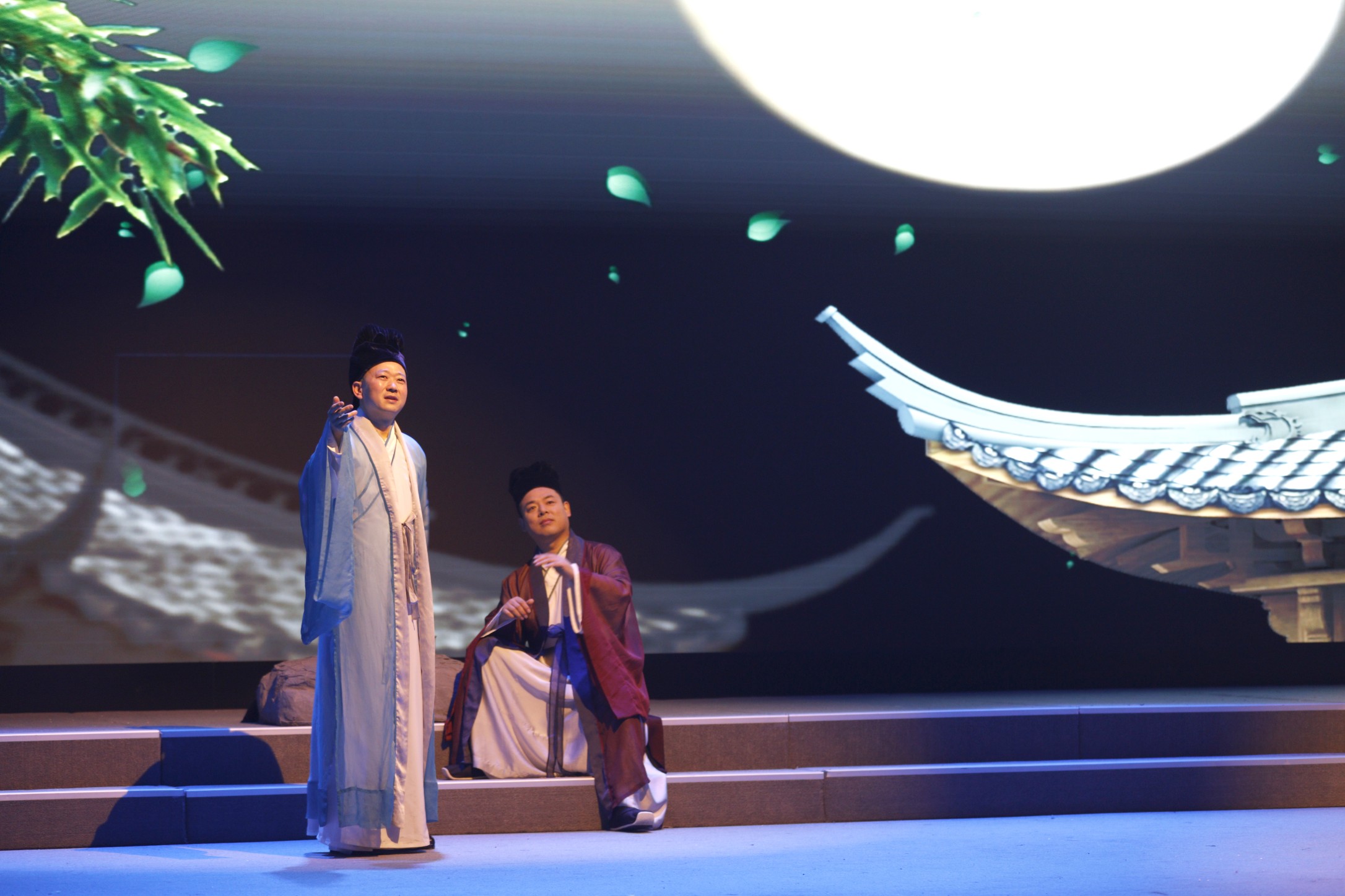 情景表演《忆故人》以古琴、箫合奏,朗诵,吟唱三种表演方式来展现自然与人文的纯美意境。《忆故人》吟唱过后,琴箫合奏、乐音悠悠,与诗词朗诵《破阵子·春景》共同展现了古人喝茶饮酒赏琴品箫的春日怀古的场景。词音未落,一曲瑟箫合奏伴着诗词吟唱《春夜别友人》娓娓道来春日依依离别之情。