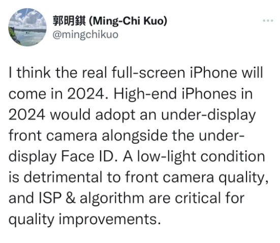 郭明錤在文中称,“我认为真正的全面屏iPhone将在2024 年问世。2024年的高端iPhone将采用屏下前置摄像头和屏下Face ID。弱光条件不利于前置摄像头质量,而 ISP 和算法对于质量改进至关重要。”