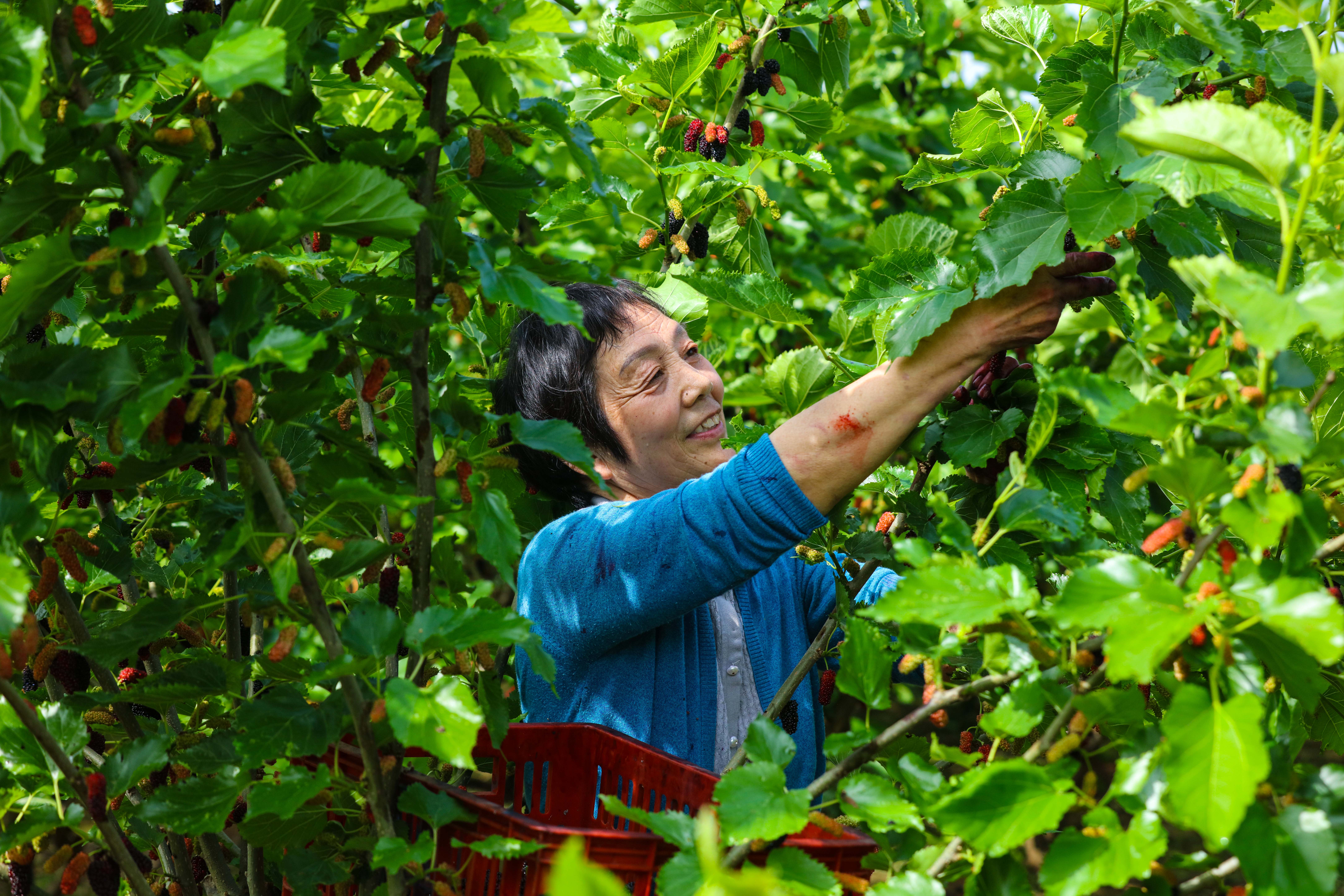 大河网讯 4月26日,游客在信阳市光山县弦山街道办事处椿树岗村世旺生态园采摘桑葚。近年来,该生态园共种植季节性水果葡萄、桑葚、桃、李、太空莲、芡实等共计1500余亩。生态园将水果采摘和旅游业结合起来,以观光旅游采摘带动水果销售,吸引了众多游客入园采摘水果、购买水果,不断打造特色高效农业和乡村旅游,助力乡村振兴,小小桑葚成为当地村民的致富果。(谢万柏/文图)