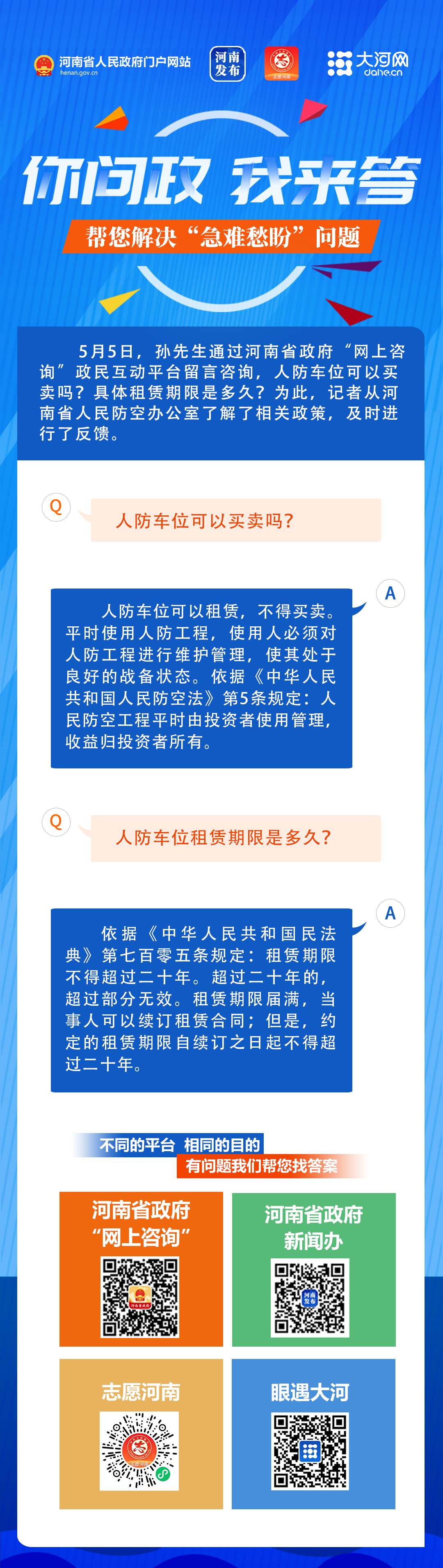 大河网讯(记者 郭栩汝)人防车位租赁问题是不少找不到停车位的小区业主关心的热点。近日,网友孙先生通过河南省政府“网上咨询”政民互动平台留言,咨询关于河南省人防车位租赁的相关政策问题。