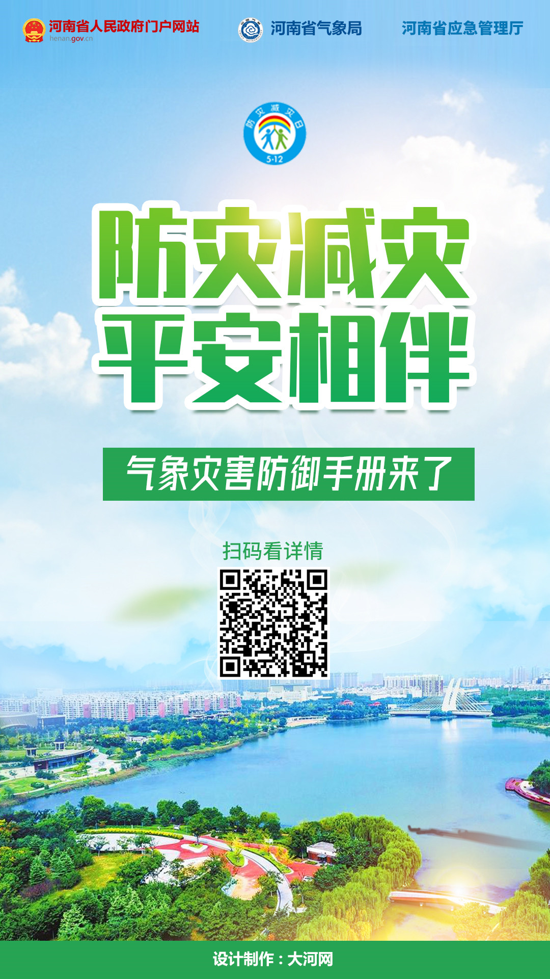 大河网讯 暴雨预警信号有哪些?大雾天气如何做好防护?遭遇冰雹怎么办?快来点击手机屏幕按钮,一键get气象灾害知识和防范应对技能。5月12日是第14个全国防灾减灾日,今年的主题为“减轻灾害风险,守护美好家园”,河南政府网、河南省气象局、河南省应急管理厅联合推出“防灾减灾 守护安全”科普专题,为广大网友送上气象灾害防御手册,赶快收藏起来吧!防灾减灾,一起行动!(统筹/银新玉 文案/孟媛 莫韶华 设计/刘昱渤)