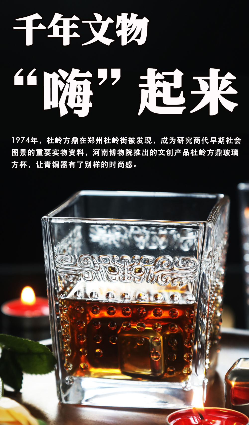 灵感来源于杜岭方鼎的玻璃方杯,霸气十足,炯炯有神的双目,似乎在不停引人用它品一杯佳酿;萌态十足的杜岭方鼎胸针,让青铜器有了别样的时尚感;以杜岭方鼎为原型设计的卡通“小杜岭”,还成了河南博物院虚拟讲解员,为参与者带来全新的体验……
