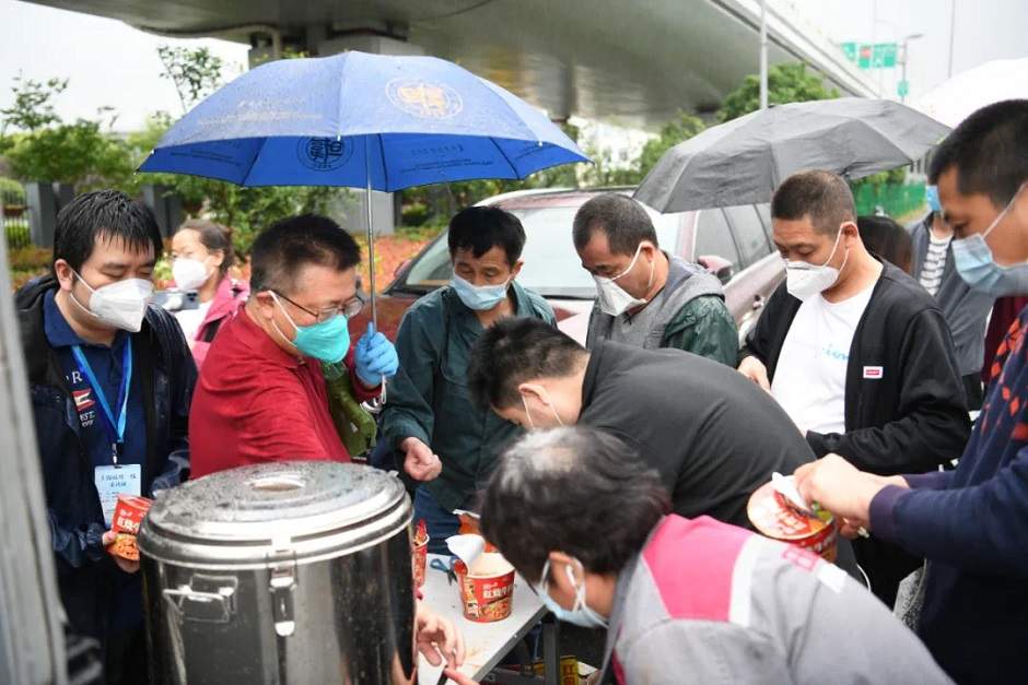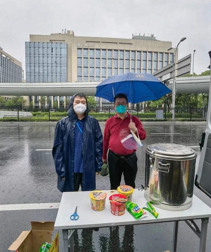 昨晚在雨中,在520这个特殊的日子,我们当场冲泡这300盒方便面一一送给滞留者。虽然目光所至,很多滞留者都疲惫、无奈、甚至有一点点伤心,但我们依旧想对每一个即将离开上海的人说:谢谢你们来过上海!